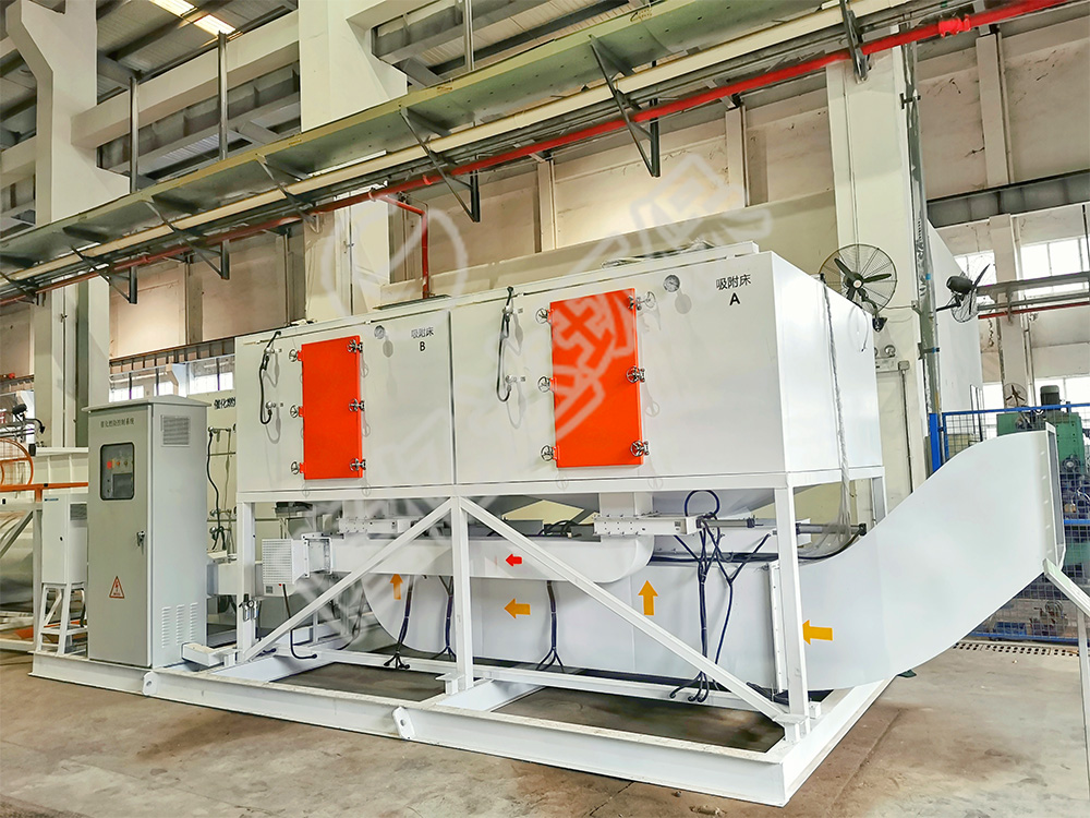 2、活性炭脫附再生流程:當吸附床吸附飽和后,可啟動脫附風機對該吸附床脫附,脫附氣體首先經(jīng)過催化床中的換熱器,然后進入催化床中的預熱器,在電加熱器的作用下,使氣體溫度提高到280℃左右,再通過催化劑,有機物質(zhì)在催化劑的作用下燃燒,被分解為CO2和H2O,同時放出大量的熱,氣體溫度進一部提高,該高溫氣體再次通過換熱器,與進來的冷風換熱,回收一部分熱量。從換熱器出來的氣體分兩部分:一部分直接排空;另一部分進入吸附床對活性炭進行脫附。當脫附溫度過高時可啟動補冷風機進行補冷,使脫附氣體溫度穩(wěn)定在一個合適的范圍內(nèi)。